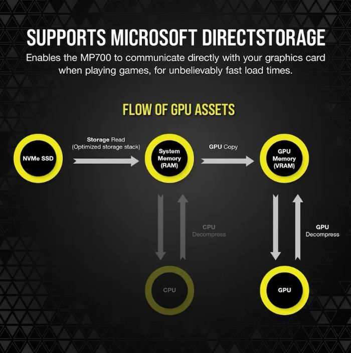 Corsair has specifically advertised the MP700 in conjunction with Microsoft's DirectStorage technology, which uses GPU decompression to enhance game loading speeds. This is however not a hardware-specific technology as it will also work with other high-end M.2 SSDs (including those using the PCIe 4.0 interface).